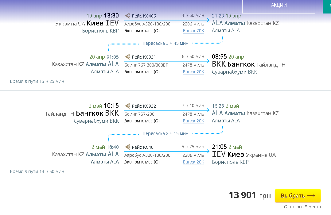19 апр, 13:30 – 21:20, Киев (Борисполь) — Алматы, KC 406