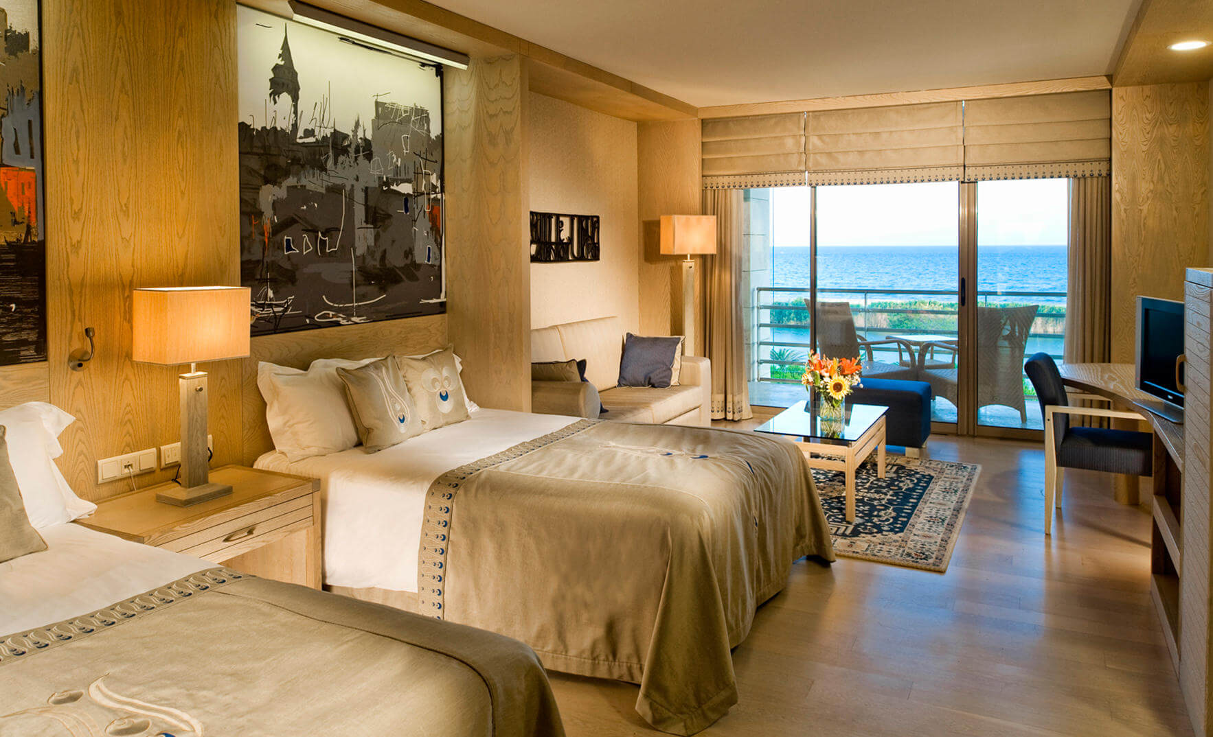 Номер в 117 кв.м. с двумя спальнями,большой гостиной, рабочим кабинетом и террасой или балконом с джакузи с видом на территорию и море.