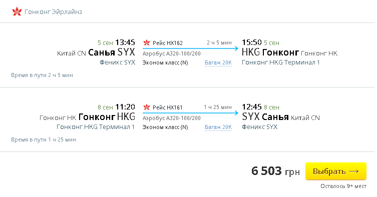 9 сен, 11:20 - 12:45, Гонконг - Санья(Феникс)