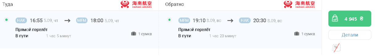 Примерный просчет перелета в Макао из Хайкоу