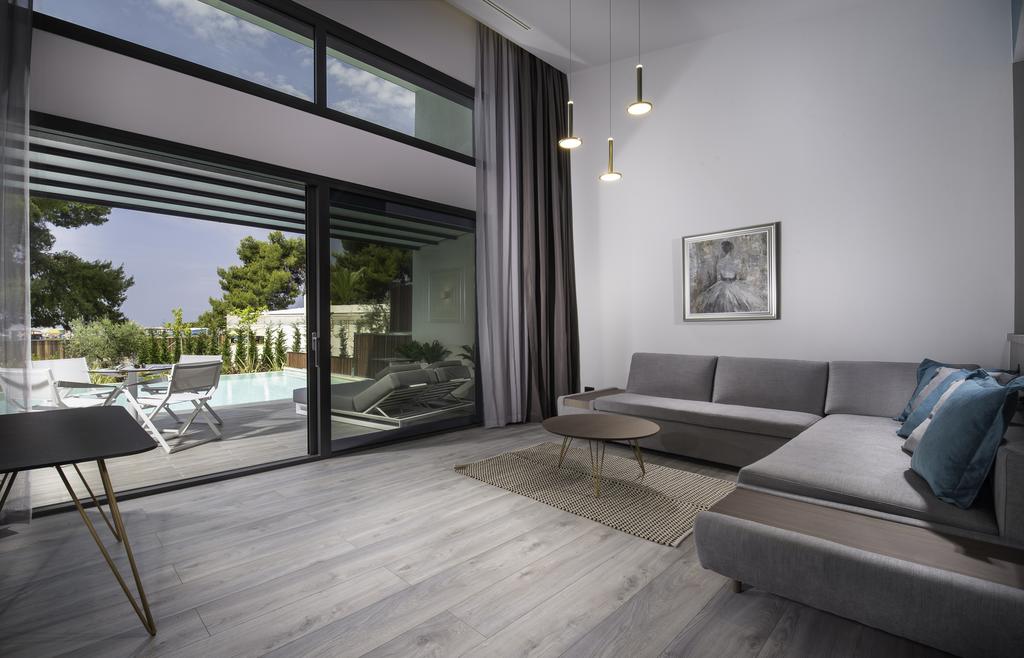 Номер (74 кв.м) на первом этаже с персональной аквазоной и патио для отдыха на свежем воздухе. Гостевая зона с мягким уголком, двуспальная кровать, дополнительное спальное место. Просторная ванная комната разделена на секции.