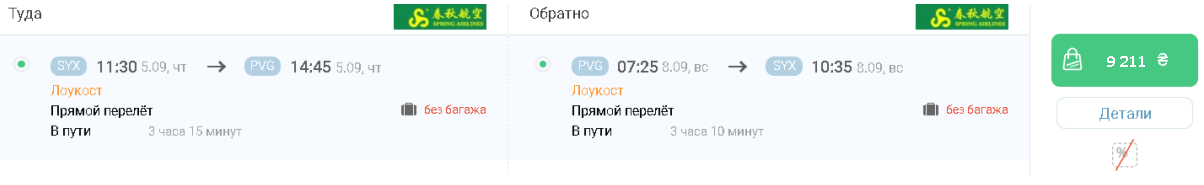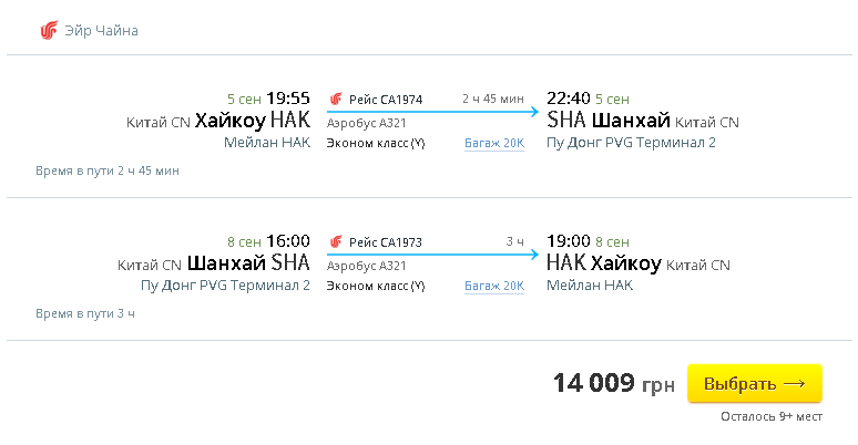 Примерный просчет перелета в Шанхай из Хайкоу