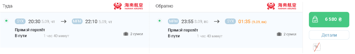 Перелет длится 1 час 5 минут, вылеты из аэропорта Мейлань в Макао совершаются по вторникам, четвергам, пятницам и воскресеньям. Прямой рейс выполняется только а/к Hainan Airlines, 1 раз в день.