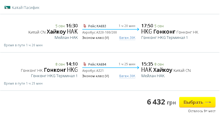9 сен, 14:10 - 15:35, Гонконг - Хайкоу(Мейлань)