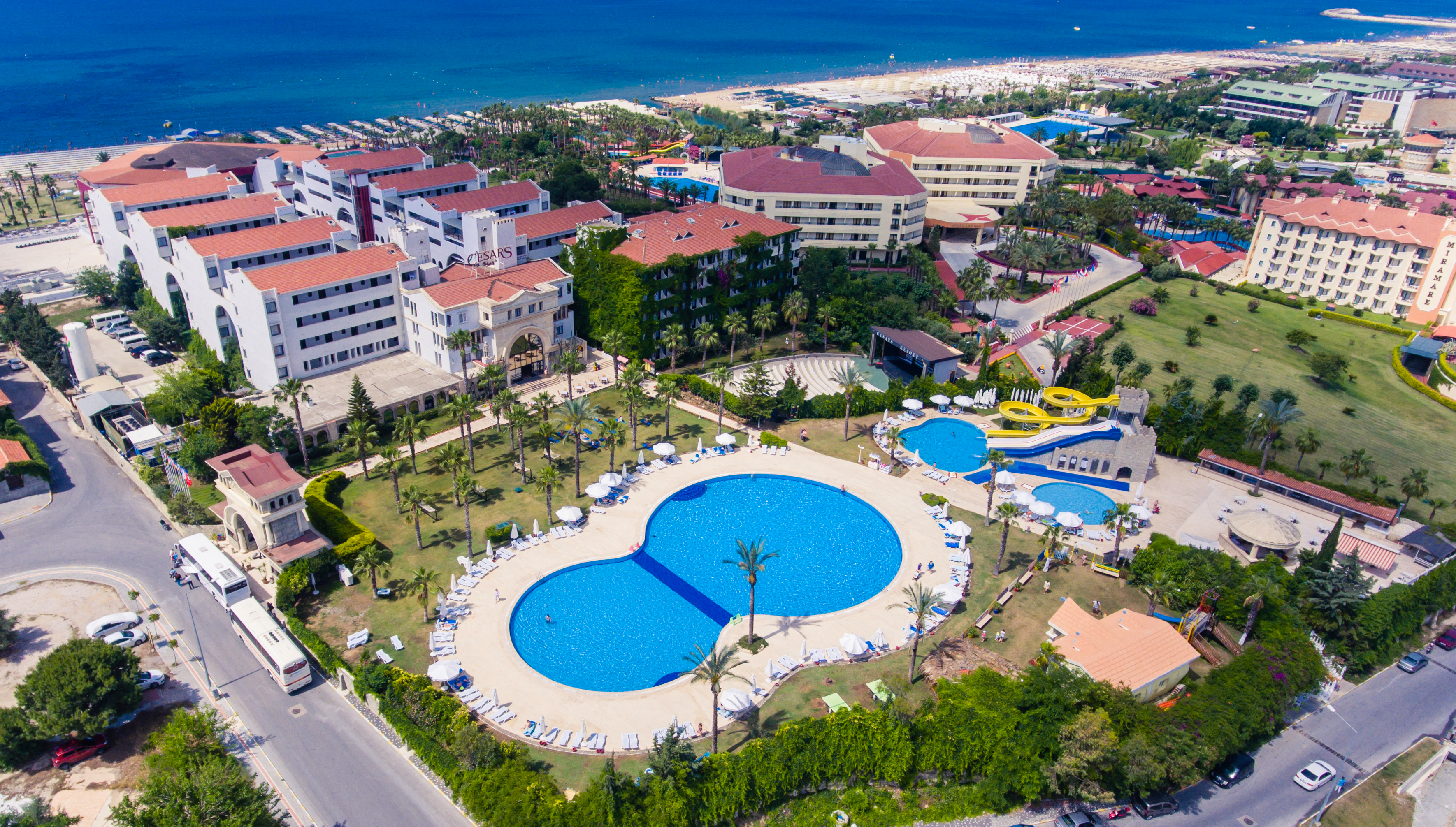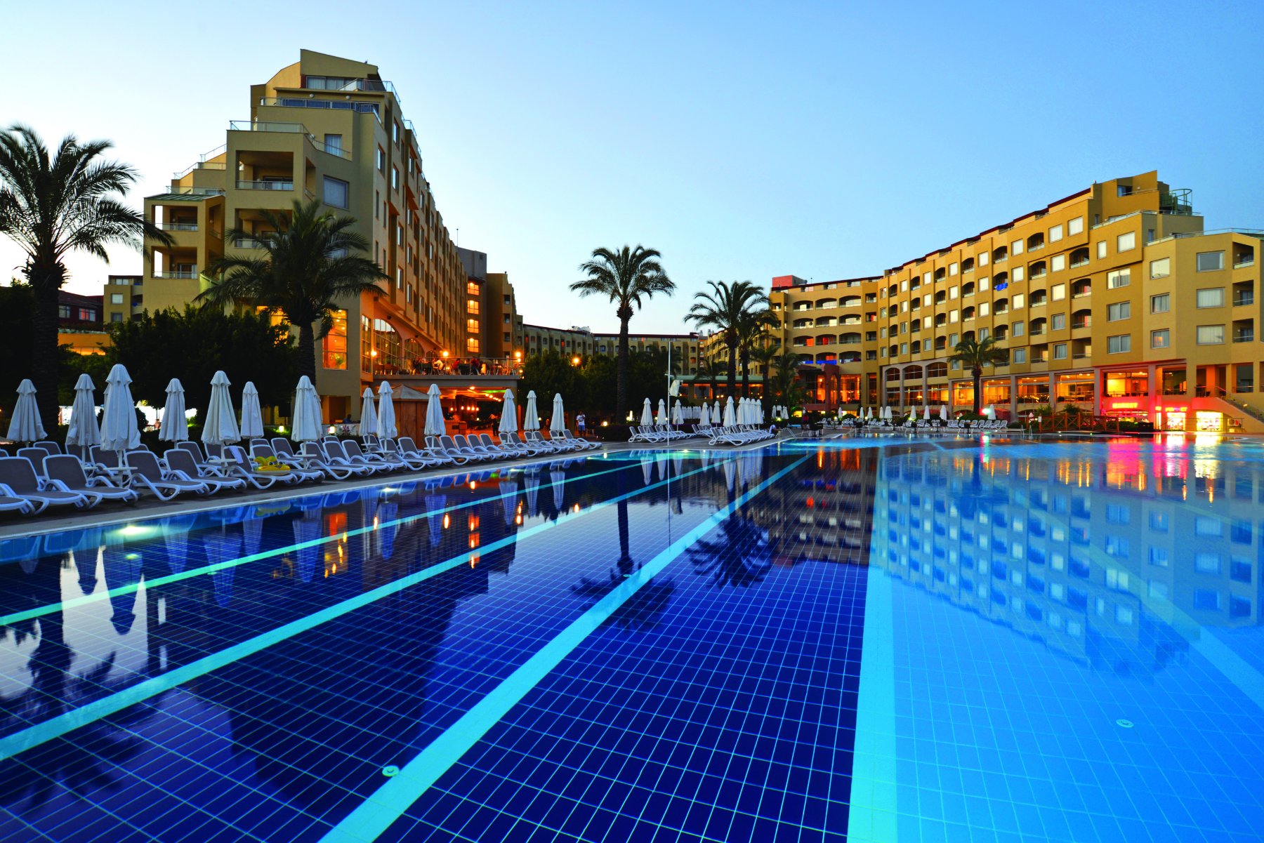 На территории отеля есть 3 бассейна: открытый — 1006 кв.м., закрытый — 112 кв.м. и бассейн с 3-мя горками — 150 кв.м. Также гости могут посетить дискотеку, амфитеатр, турецкую баню и сауну.