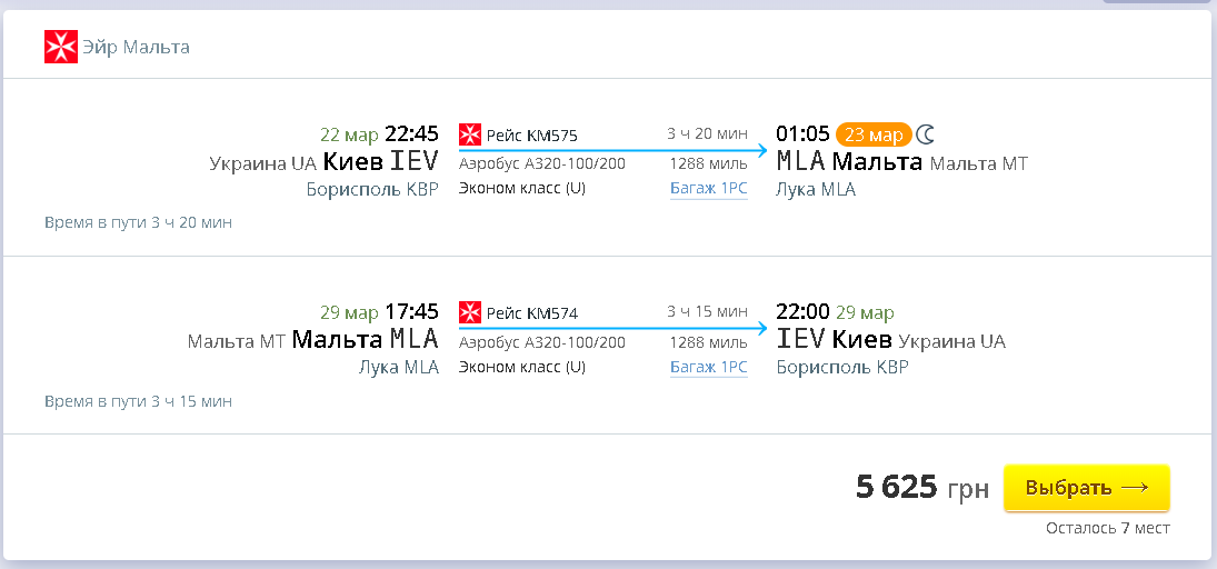 29 мар, 17:45 – 22:00, Луа (Мальта) — Киев (Борисполь), KM 574