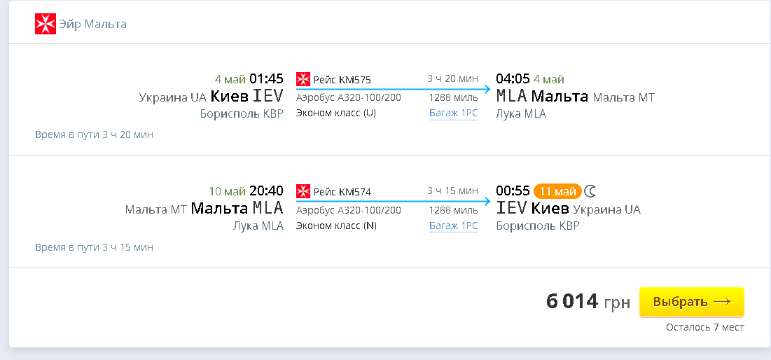4 май, 01:45 – 04:05, Киев (Борисполь) — Луа (Мальта), KM 575
