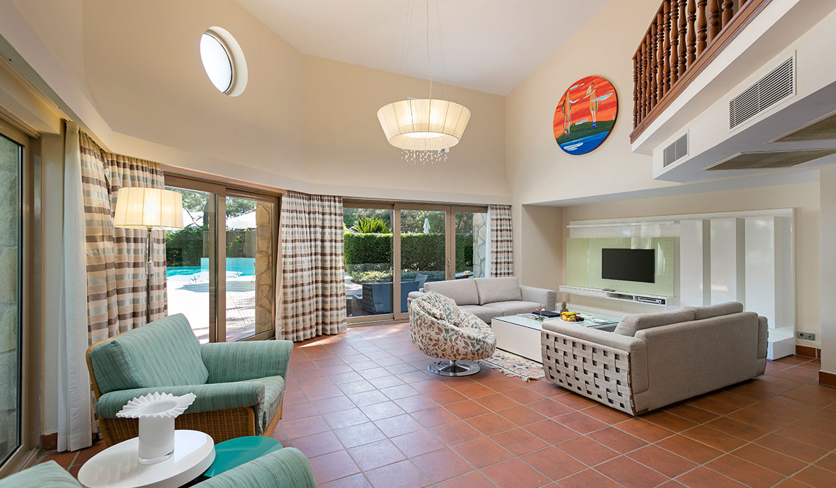 Отдельная вилла (220 кв.м) с тремя спальнями и ванными комнатами. Есть джакузи и кухонная зона, гостиная. Великолепное оформление, комфортная мебель для сна, функциональная меблировка кухни.